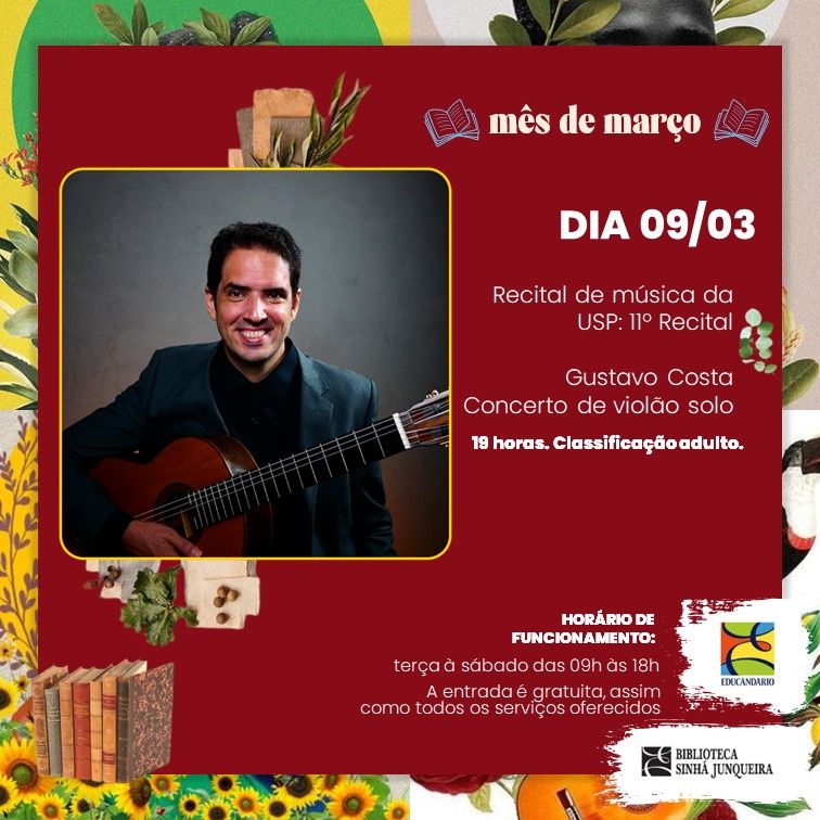 No dia 9 de março, às 19h, as apresentações deste ano da Série Recitais na Biblioteca Sinhá Junqueira retornam com o concerto de violão do professor Gustavo Costa, da Faculdade de Filosofia, Ciências e Letras de Ribeirão Preto (FFCLRP) da USP.